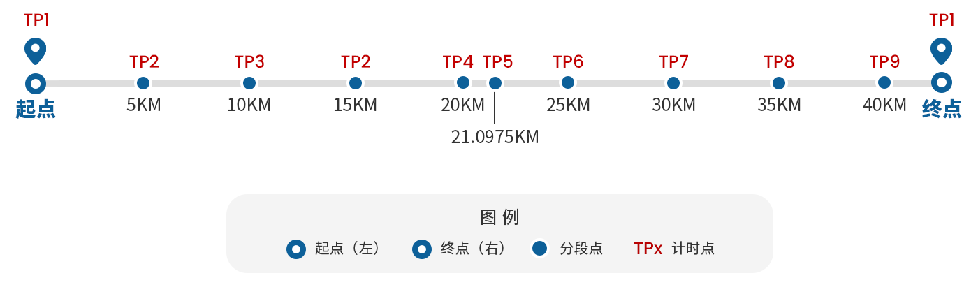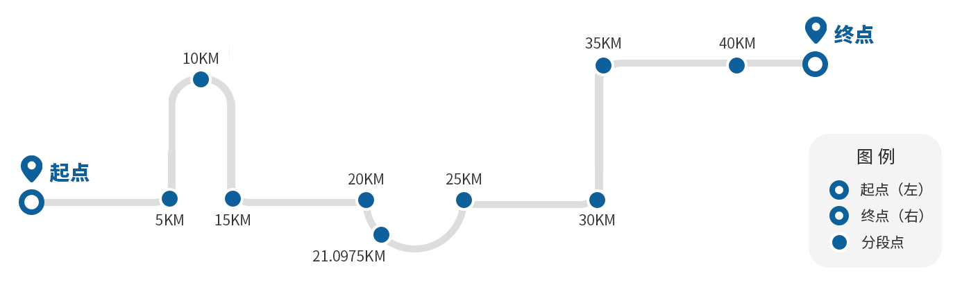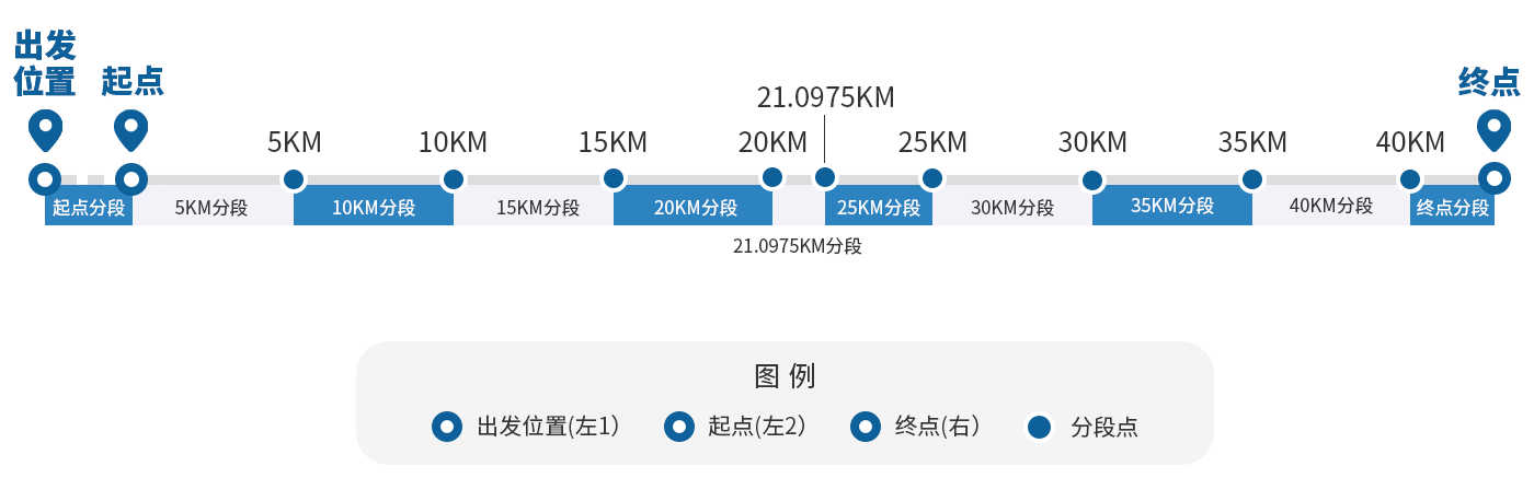 与分段对应的是分段点的概念。对于一个分段而言,用分段的终点代表这个分段。例如,5KM 到 10KM 分段,可以简化称为 10KM 分段,这个分段的终点是 10KM 分段点。反过来说,10KM 分段是指 5KM 到 10KM 的分段,10KM 分段点代表 10KM 分段。