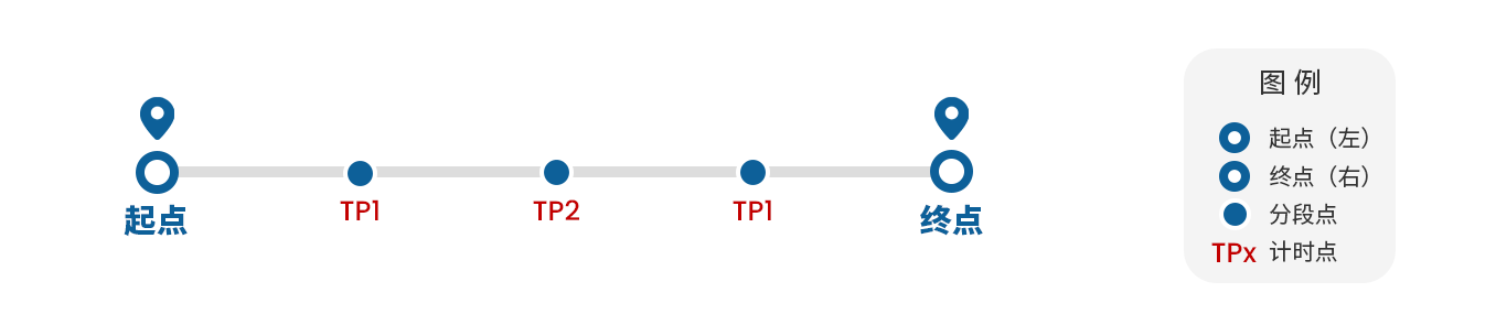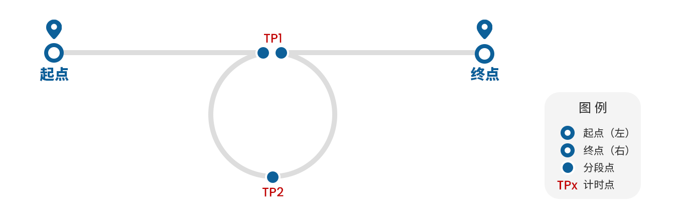 计时点是放有计时设备的地点,运动员携带计时芯片通过这个计时点时,芯片将被读取数据。计时点和分段点是完全不同的两个概念,一个分段点对应一个计时点,一个计时点可以对应多个分段点。将计时点和分段点分离开后,可以轻松实现绕圈的赛道和折返的赛道的描述。通过以下两个例子说明。
