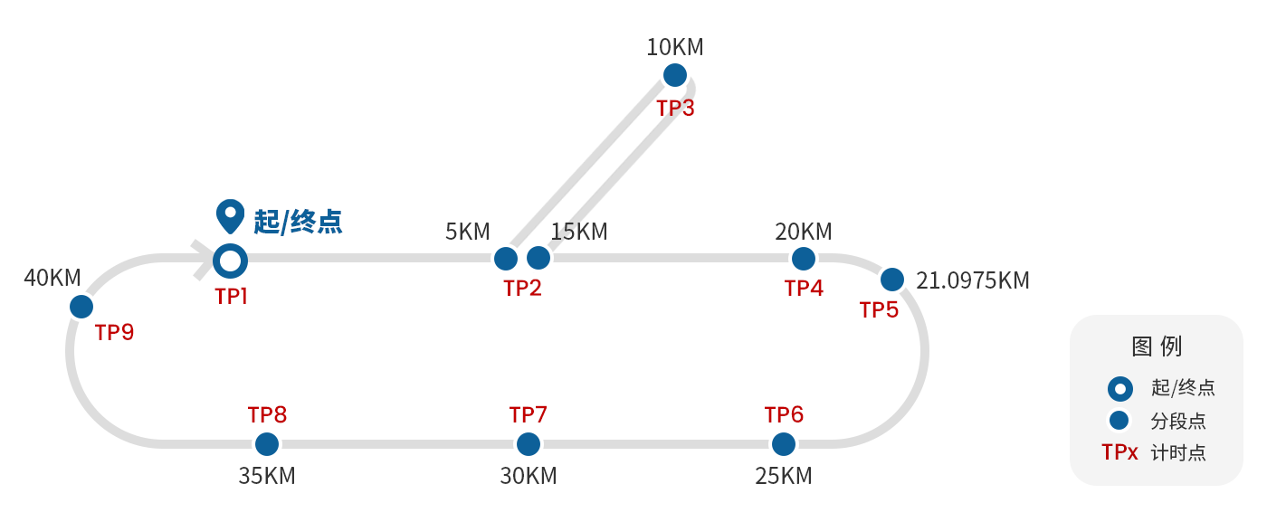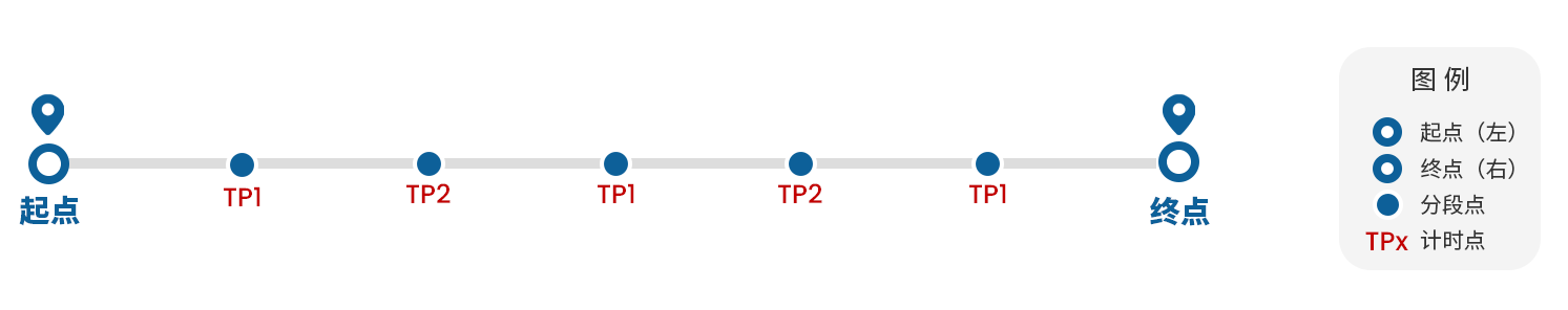 如果此赛道规定出发绕 2 圈后到达终点,分段点和计时点如图 2.5 所示。