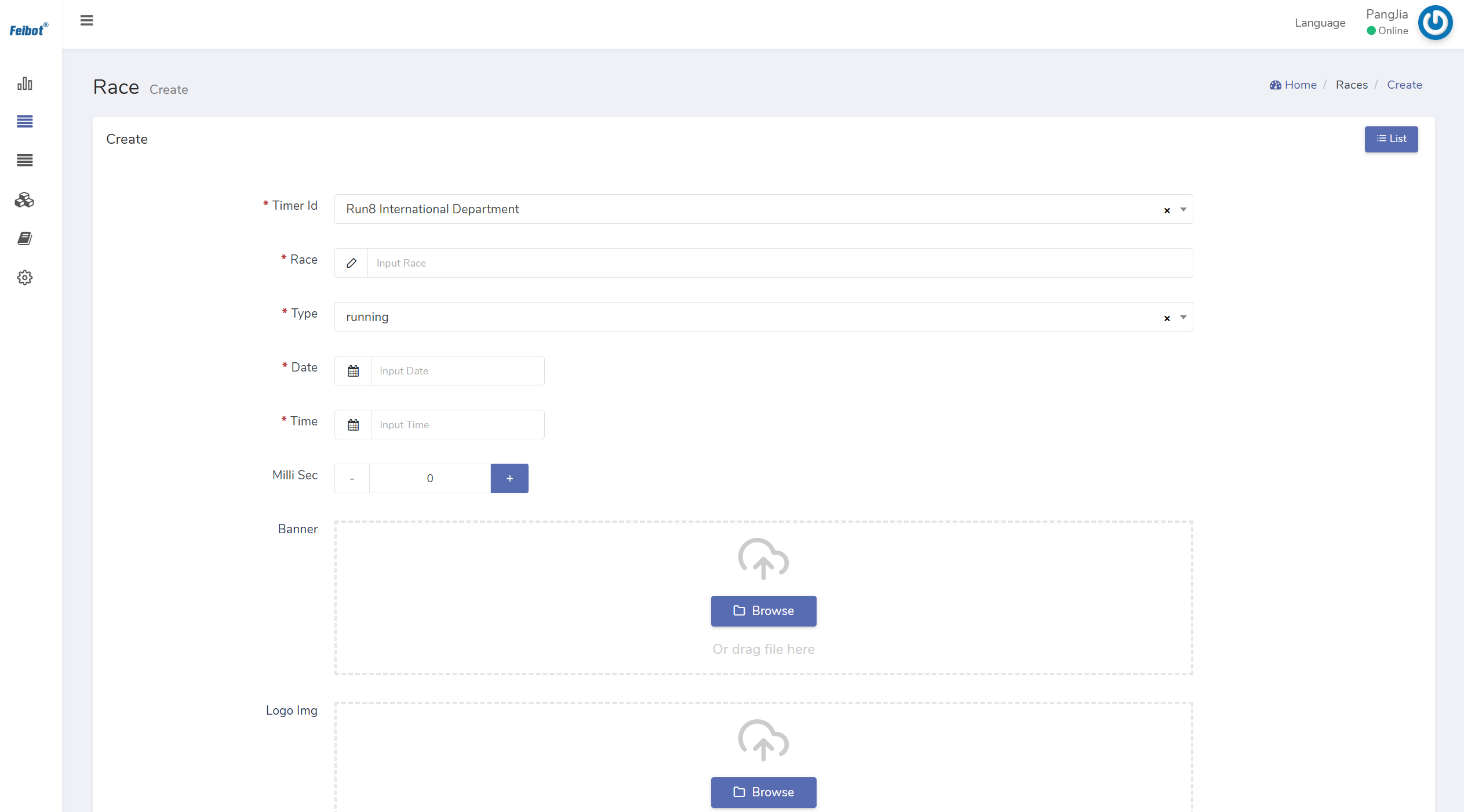 Enter the event management page in the Run8 Cloud timing backend, click the "+ New" button in the top right corner, and enter the "create" page. After filling in the relevant information, click the "Submit" button to complete the creation of the new event (as shown in Figure 2.1.)