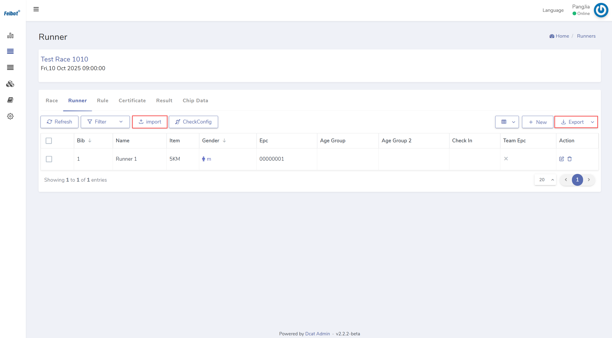 Enter the runner list page in the Run8 Cloud timing backend. Click the "Export" button in the top right corner. Based on the exported Excel list template, edit the participant information according to the column headers and save the file. Then, return to the runner list page, click the "import" button in the top left corner, and upload the list to the backend (as shown in Figure 2.2.)