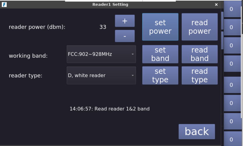 The check of the timing device's reading feature mainly covers: reader type, working band, and reader power. Each timing device can connect to two readers. When using the system, ensure that the readers connected to the same timing device are set the same (as shown in Figure 2.7.)