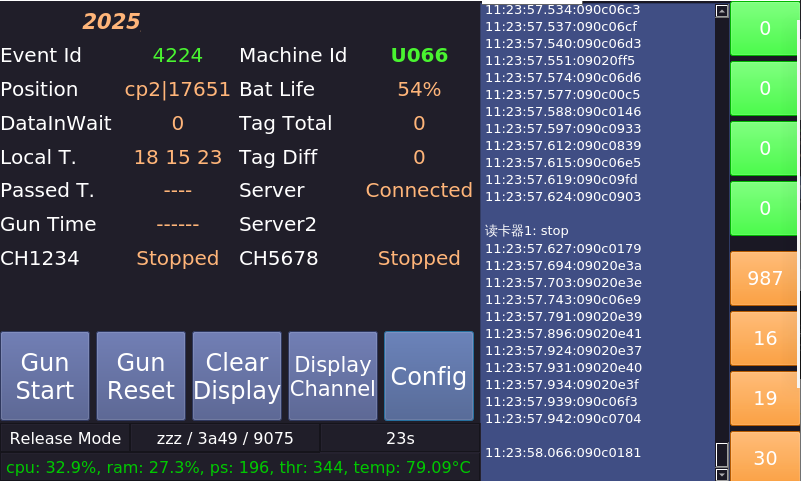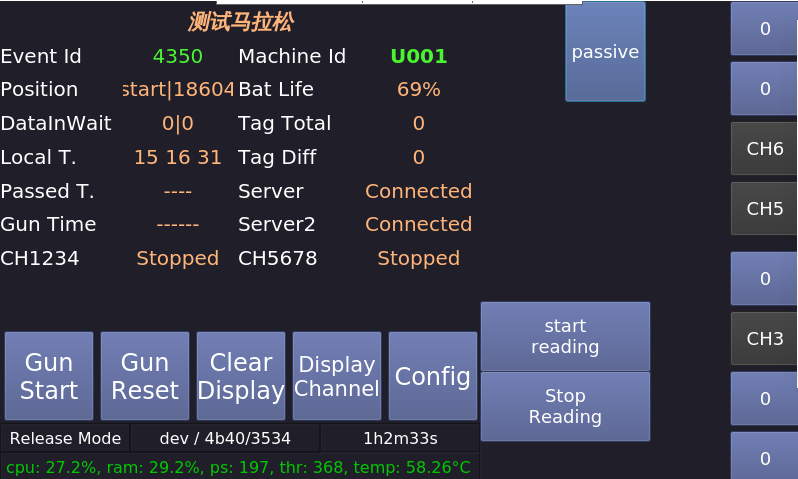 Connect the timing device to the UHF antenna. The user can hold the chip and stand 1.5 meters away from the mat to test whether each mat can properly read the chip. If the chip is successfully read, the timing device's beeper will sound, and the corresponding number of chips read by the mat will be displayed at the reader button on the right side of the screen (as shown in Figure 2.8.) If a mat cannot read the chip or requires a closer distance to read it, it indicates that the mat's antenna may be damaged and needs to be replaced or repaired.