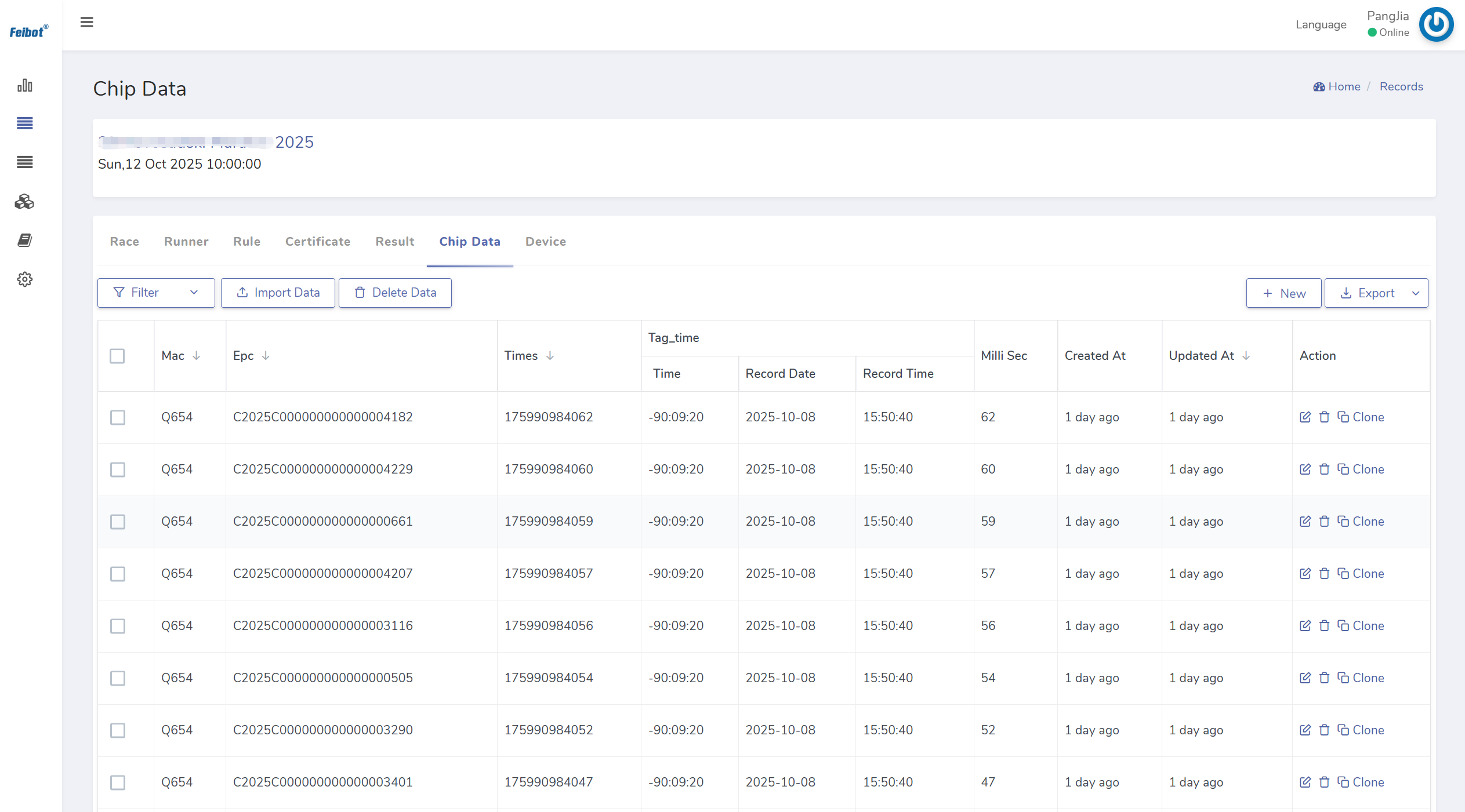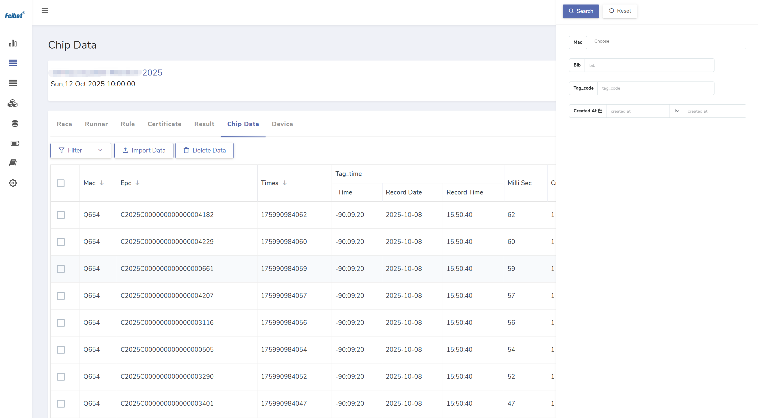 Users can view all chip data read and uploaded by timing devices to the backend in real-time on the "Chip Data" page of the Run8 Cloud timing backend. Users can also filter and view the reading state of a specific chip according to their needs, or check all chip data read by a particular device (as shown in Figure 2.24.)