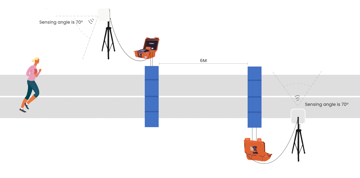 When the side antenna is in operation, it creates an electromagnetic induction area with a transverse radiation angle of about 70° within a 9-meter range in front of the antenna. When used in conjunction with the FMA2 mat antenna, the first reader of the mat antenna can be disconnected from the reader box, and the side antenna should be connected to that position. Additionally, ensure that a 4-meter distance is maintained between the side antenna and the FMA2 UHF mat antenna, as shown in Figure 2.12.