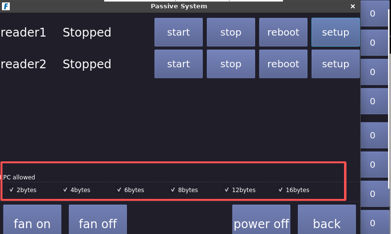 Each F800 UHF reader box can connect to up to two readers, with each reader able to connect to four antennas. By clicking the corresponding channel button on the device screen, you can independently turn each antenna on/off (the reading channels are displayed on the right side of the screen; the four channels at the bottom correspond to Reader 1, and the four channels at the top correspond to Reader 2.) Note: Each reader can turn off a maximum of three antennas, and this feature can only be used when the reading is stopped (as shown in Figure 2.22.)