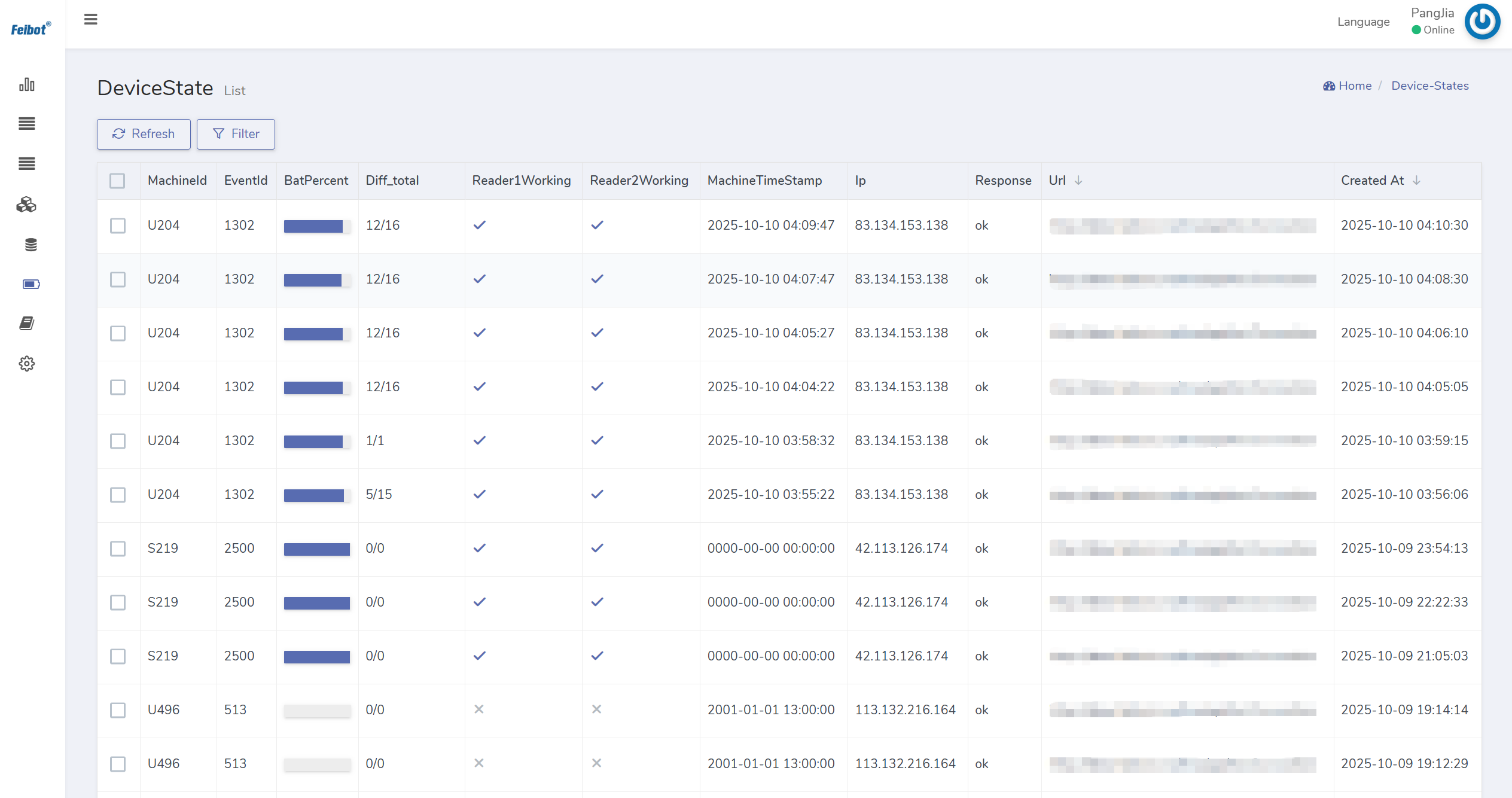Users can filter and view the connection and reading state of the timing device on the "Device State" page in the Run8 Cloud timing backend. If there is a network disconnection or a failure to read, users should promptly contact the onsite staff for inspection and restore the device's network and reading state (as shown in Figure 2.23.)
