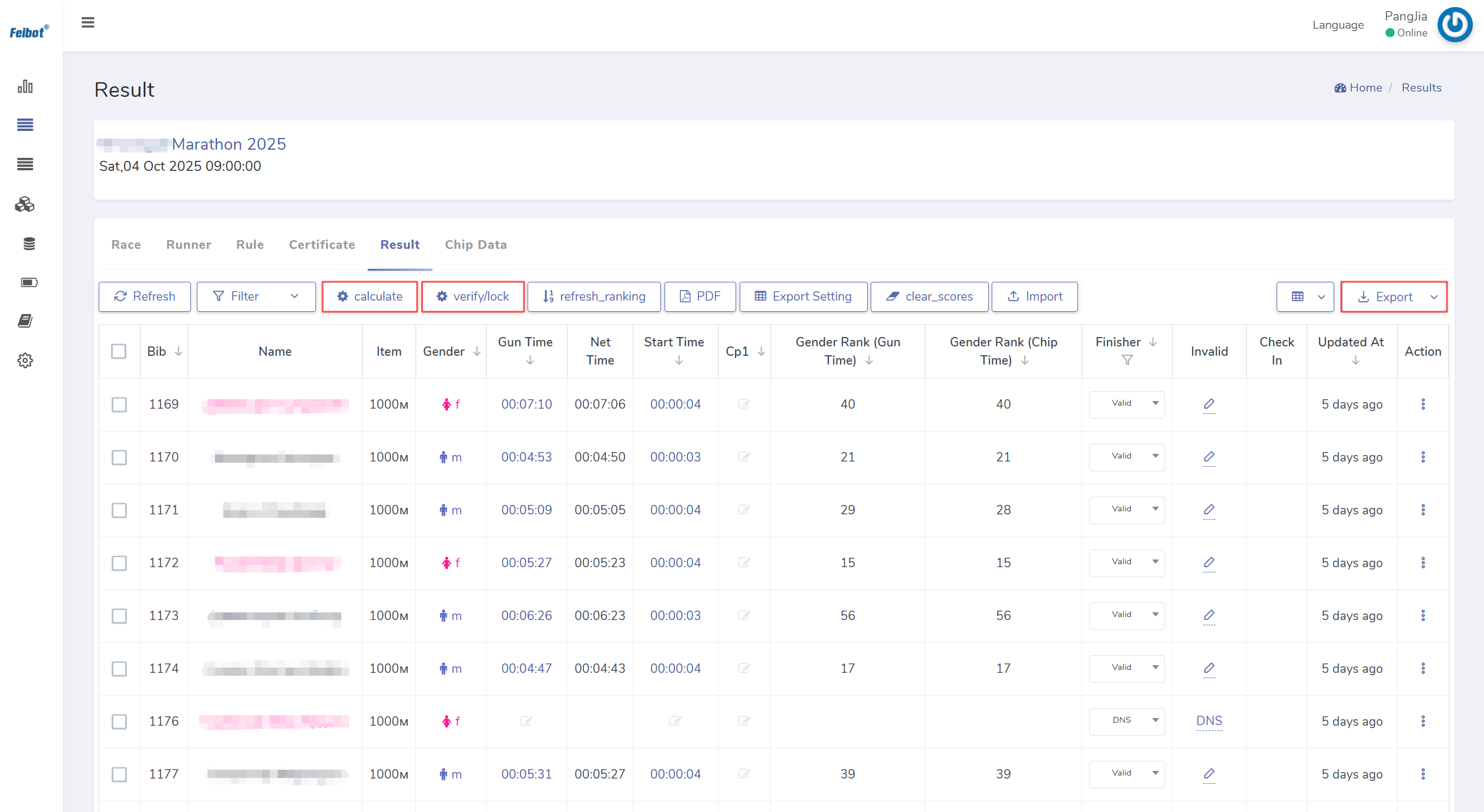 During or after the event, users can calculate the results at various timing points by clicking the "calculate" button on the "Result" page. By clicking the "verify/lock" button, users can verify whether the participants have completed the event normally based on the preset timing rules and distances. Then, users can export the result sheet by clicking the "Export" button (as shown in Figure 2.25.)