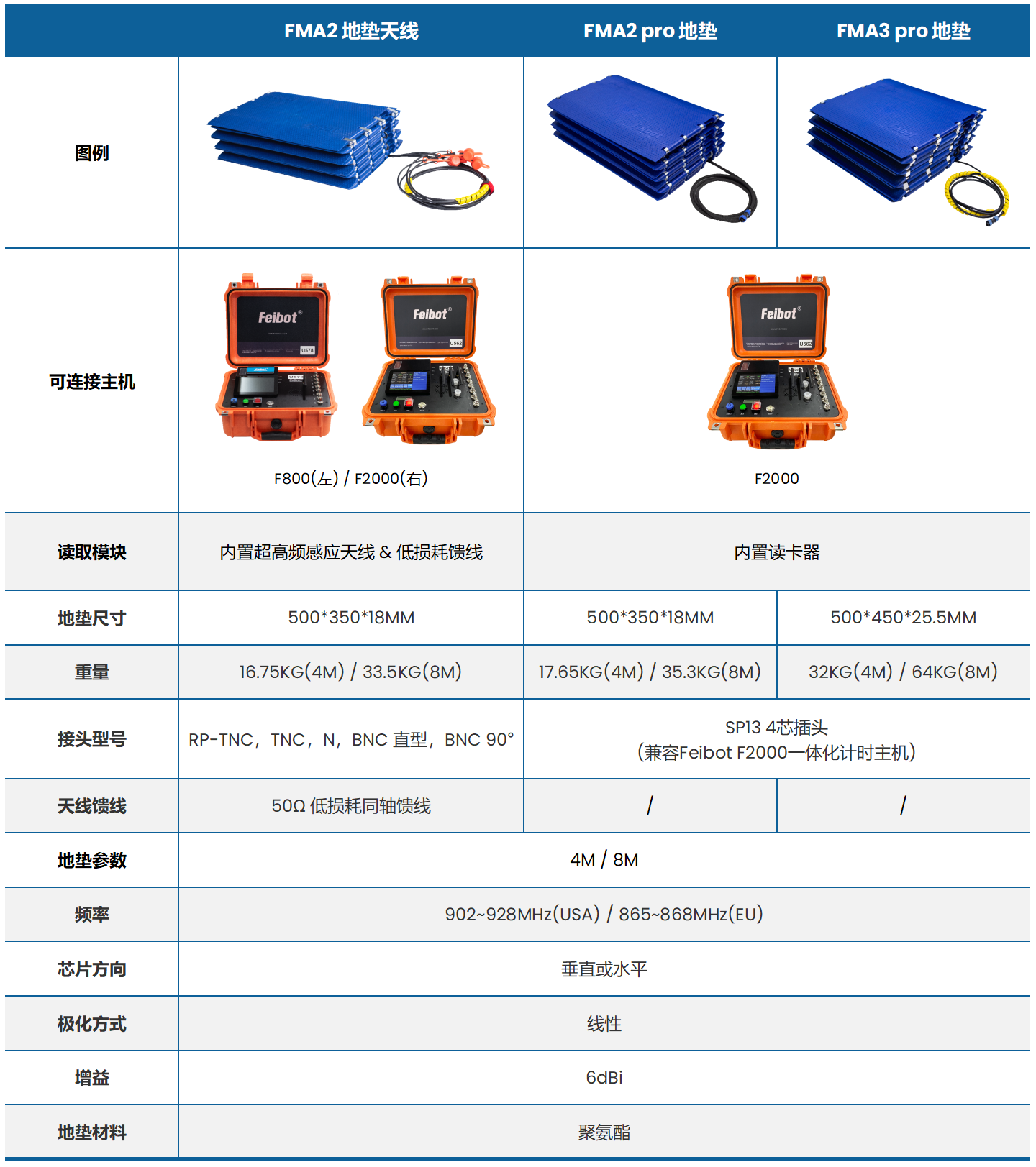 不同型号地垫天线/地垫的参数对比:FMA2地垫天线、FMA2 pro地垫、FMA3 pro地垫。