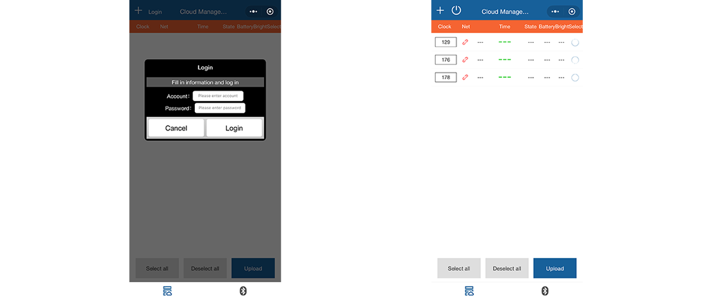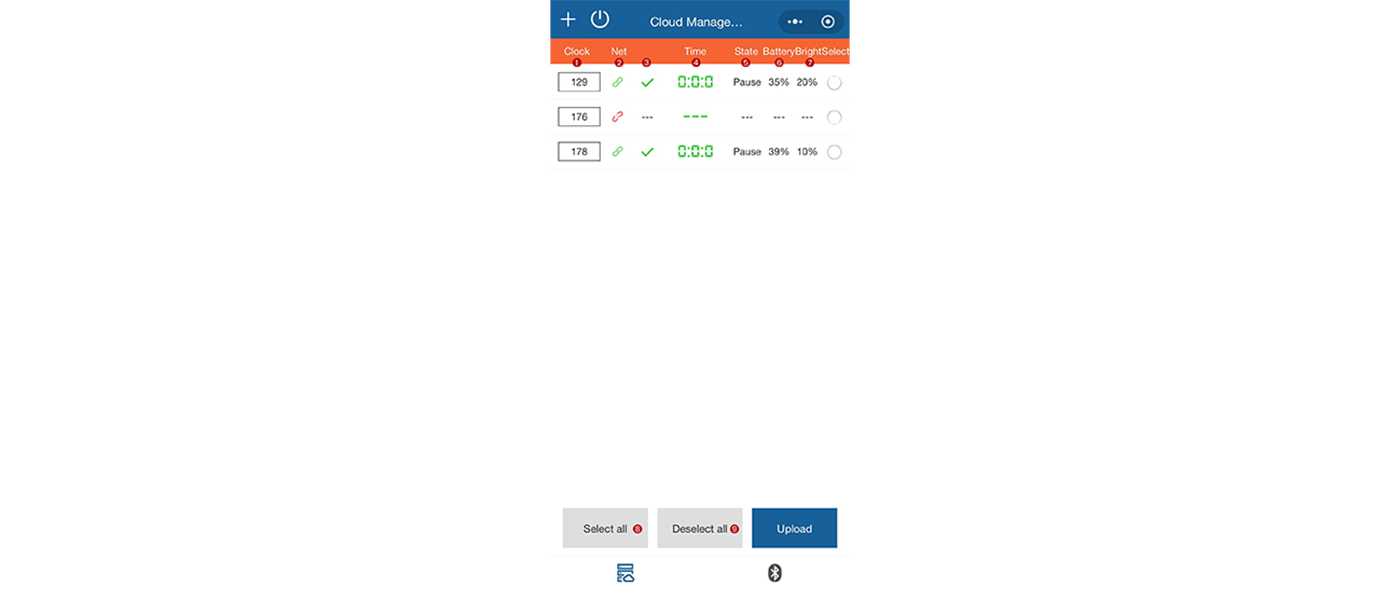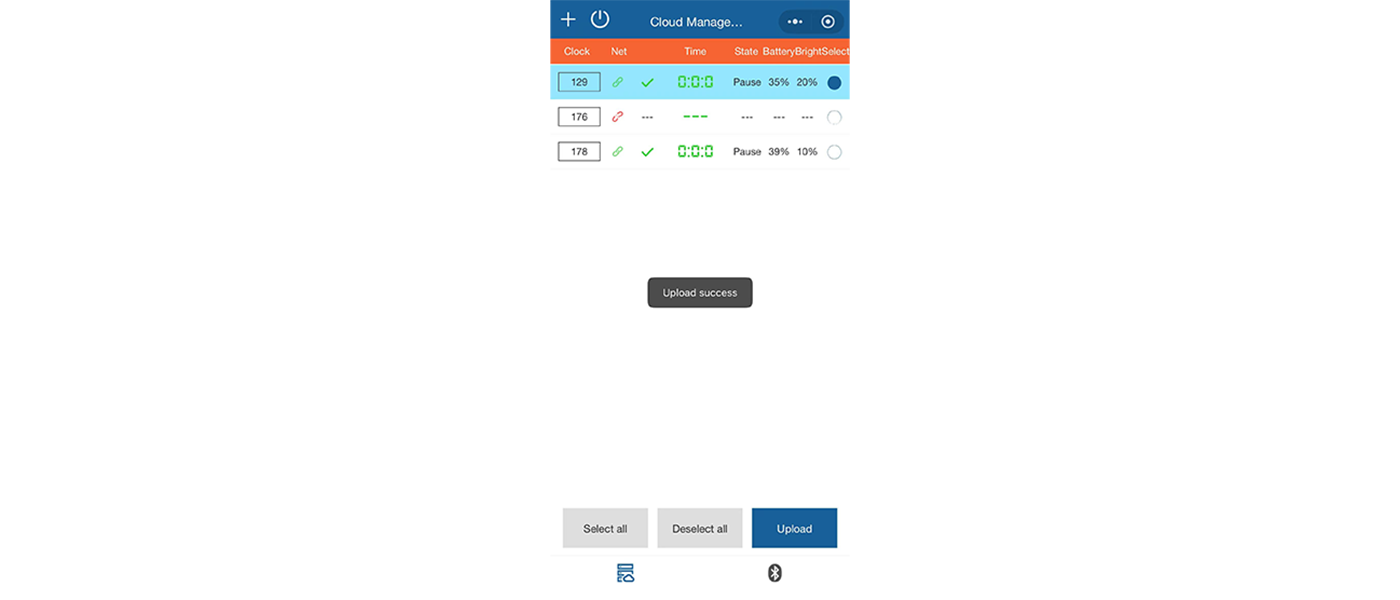 1. Select the clock you want to control and click the "Upload" button. After the "Upload success" message appears, the background color of the corresponding clock will turn blue. At this point, you can perform operations such as "Cloud Sleep," "Cloud Awakening," or "Cloud Clone" on the clock.