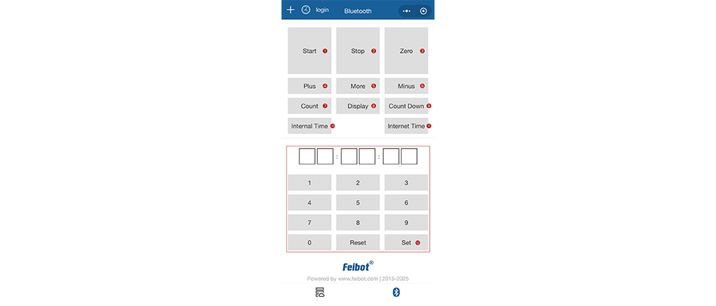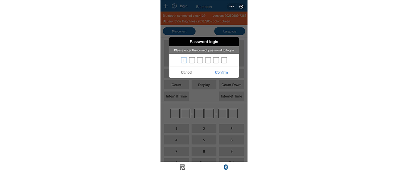 Click the Bluetooth icon in the lower-right corner to switch to the Bluetooth control page, then click the "login" button in the upper left corner. Enter the password generated by the Run8 Cloud timing backend to access the mini program. Note: The password login method can only be used with the Bluetooth control feature.
