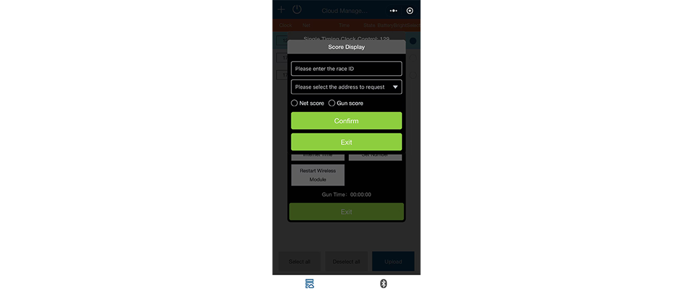 (3) Score Display: On this page, you can enter the event ID and the corresponding query address, and choose to display either "Net score" or "Gun score." After completing the settings, you can use the manual query feature (1) or use a USB reader connected to the clock to read the timing chip and display the corresponding finishing result.