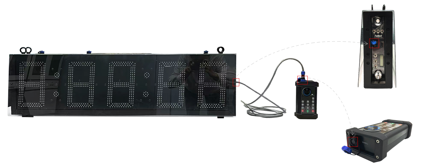 Connect both ends of the connection cable with the four-pin plug to the port of the remote control's top interface and the port of the clock's side panel interface. Once connected successfully, turn on the clock, and the remote control can be used for operation.