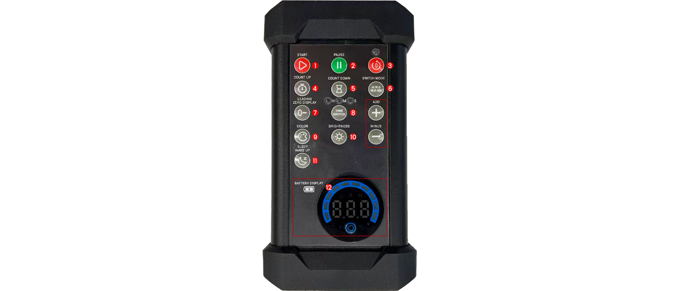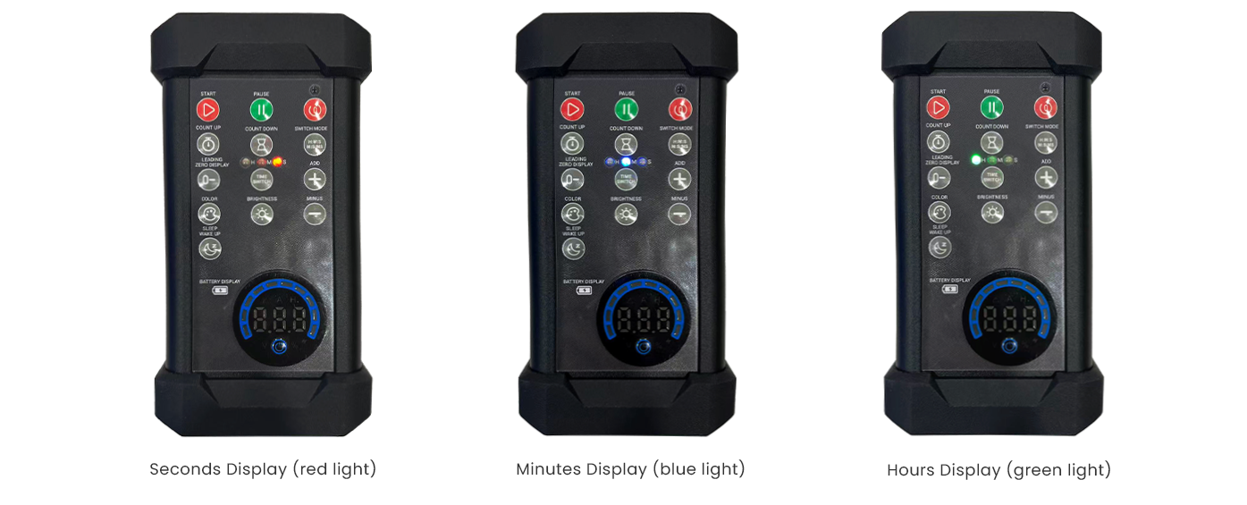 8. TIME SWITCH: Press the "TIME SWITCH" button, the red light on the seconds display will turn on. Press the "+" or "-" buttons on the right to add or subtract the seconds. Press the "TIME SWITCH" button again, the blue light on the minutes display will turn on. Press the "+" or "-" buttons on the right to add or subtract the minutes. Press the "TIME SWITCH" button once more, the green light on the hours display will turn on. Press the "+" or "-" buttons on the right to add or subtract the hours. Note: If you only need to adjust the time for a specific unit, you can switch between the units by pressing the "TIME SWITCH" button multiple times.