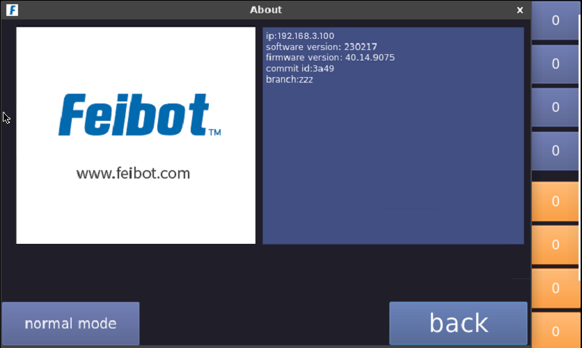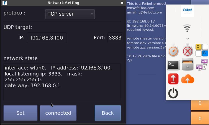 - Check the Feibot device's IP by clicking config>about, e.g., 192.168.3.100.