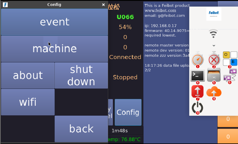 4. Click "config" again, then click button 7 on the right sidebar to upgrade to the stable version, or click button 8 to upgrade to the test version. Follow the prompts on the pop-up page to enter the username and password. If there are no prompts, do not perform any actions. The software will automatically restart after the upgrade is completed.