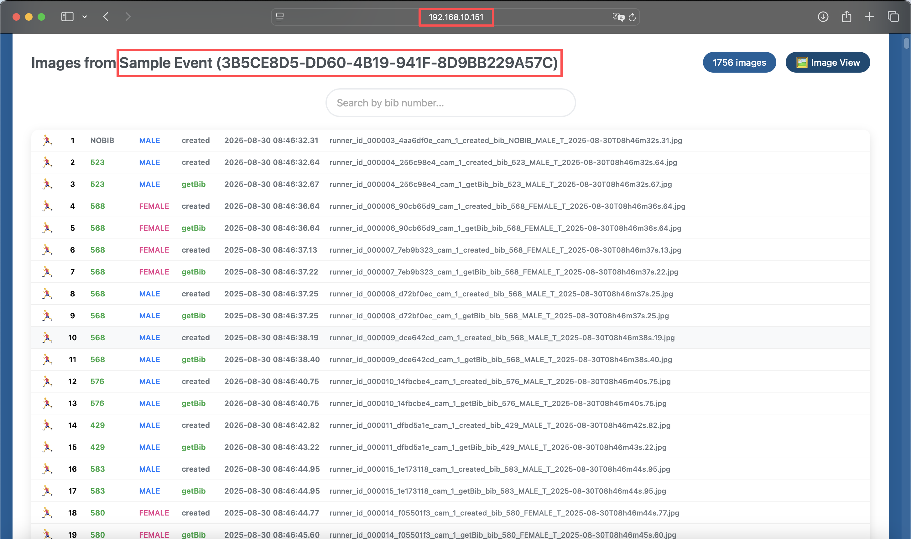 - List all images in an event: http://192.168.10.151:80/images/listlmages/eventUUlD. Replace event UUID here with one of the event UUlDs obtained from the list above. For example: http://192.168.10.151:80/images/listlmages/3B5CE8D5-DD60-4B19-941F-8D9BB229A57C.