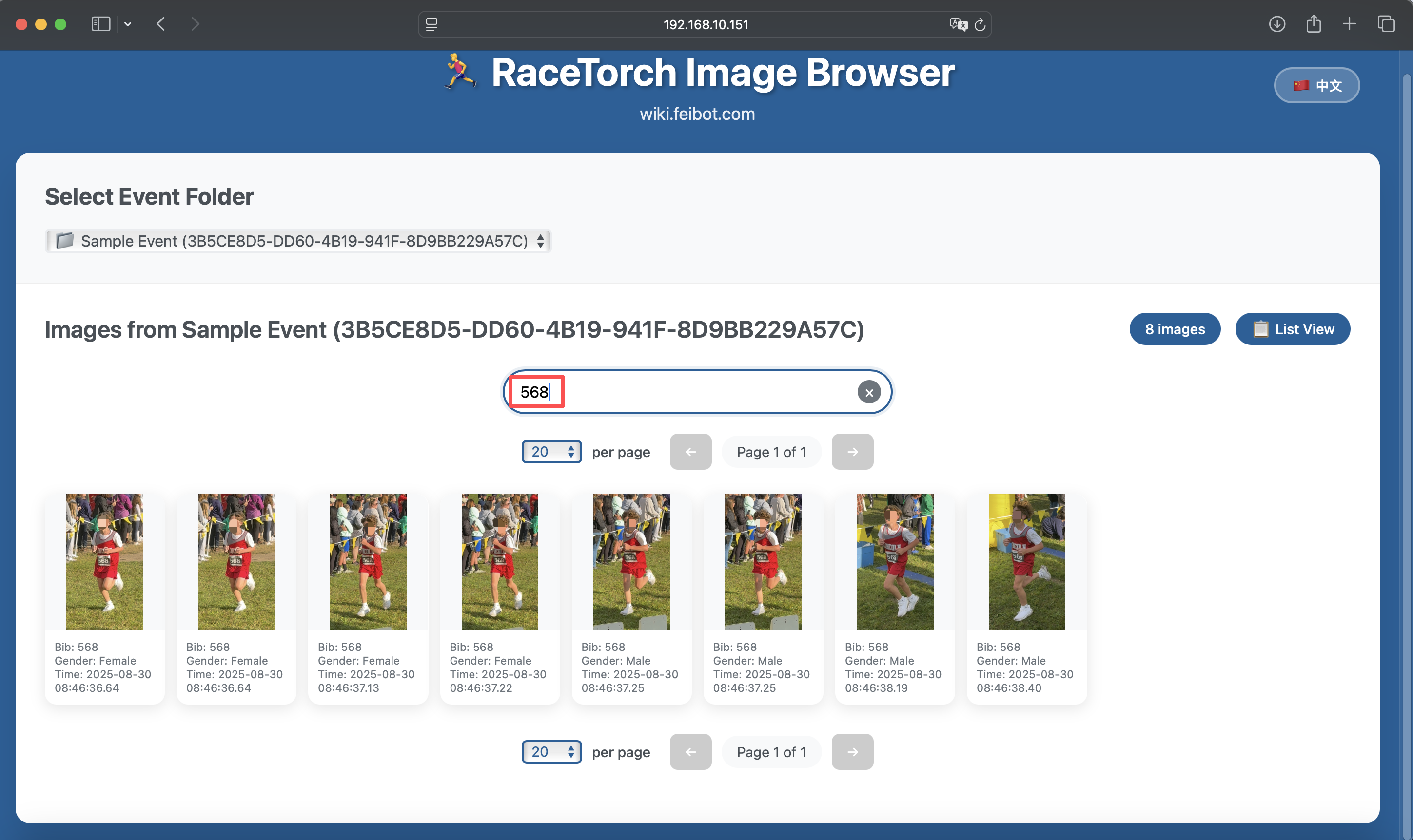 (6) After the settings are complete, enter the manually configured IP address+/images of the phone (e.g., 192.168.0.2/images) into the computer browser's address bar. This will display the event list in the current RaceTorch software.