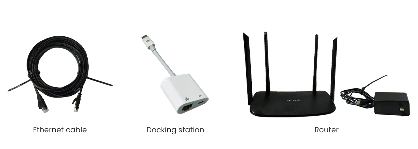 The tools required for a wired connection between an iPhone/iPad and a computer include: Ethernet cable, docking station, and router.