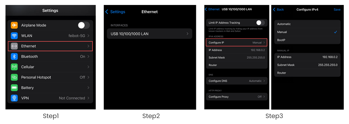 Note: When setting the IP address, ensure that the last digit after the decimal point on the computer and iPhone/iPad are not the same number.