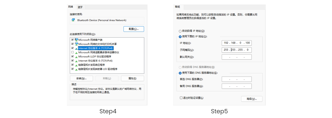 (5) Select "Internet Protocol Version 4 (TCP/IPv4)" and double-click to enter the IP config page. Choose "Use the following IP address" and manually set the computer's IP address so that it is within the same subnet as the phone's IP address.